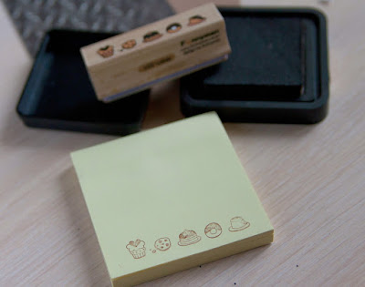 На стикерах я делаю отштампочки, не на всех листиках, выборочно. Блок стикеров приклеиваю и ставлю под пресс.