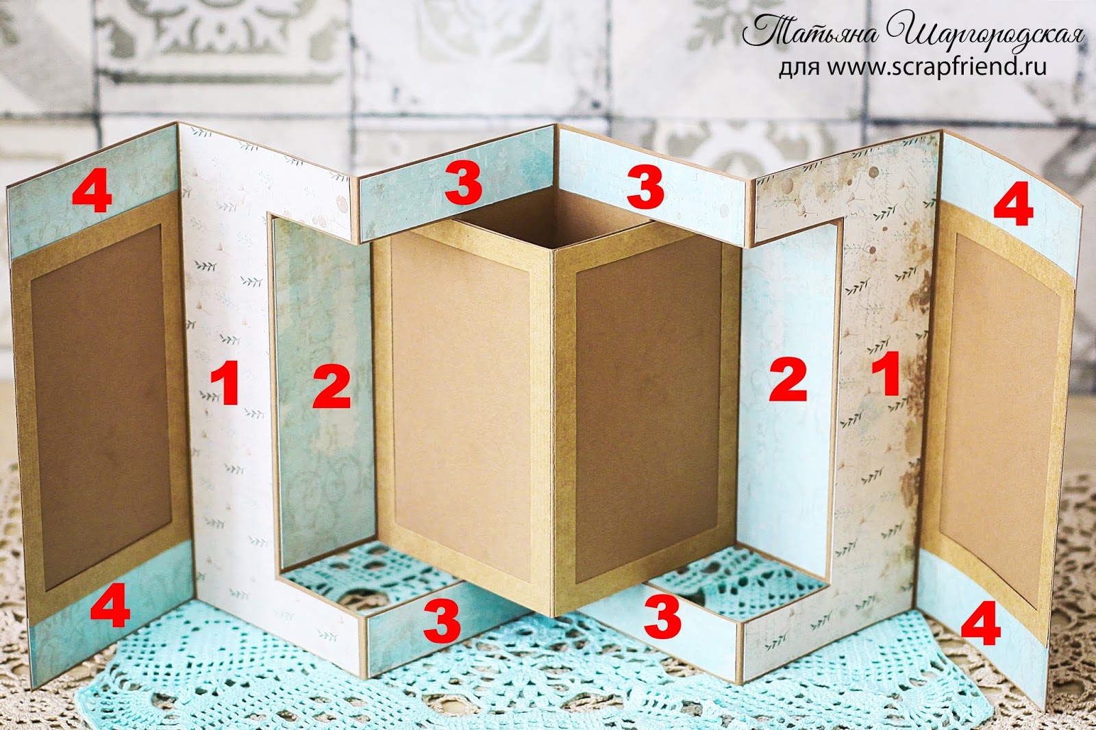 Далее приклеиваем эти детали на свои места - у меня все пронумеровано. И еще приклеиваем оставшиеся 2 рамочки - точно так же, как предыдущие, - сделав кармашек.