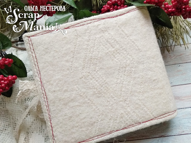Обложка обтянута мягким , вязаным трикотажем и прошита по периметру красной ниткой в цвет коллекции. Завязывается альбом на кружевную тесьму.