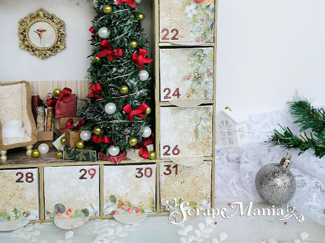 Кроме ящичков с числами в центре Адвента я поместила небольшую уютную комнату, где уже приготовились к волшебному празднику: нарядили красавицу-ёлку, упаковали подарки... кажется, ещё немного и вся комната наполнится весёлым смехом и радостными лицами.