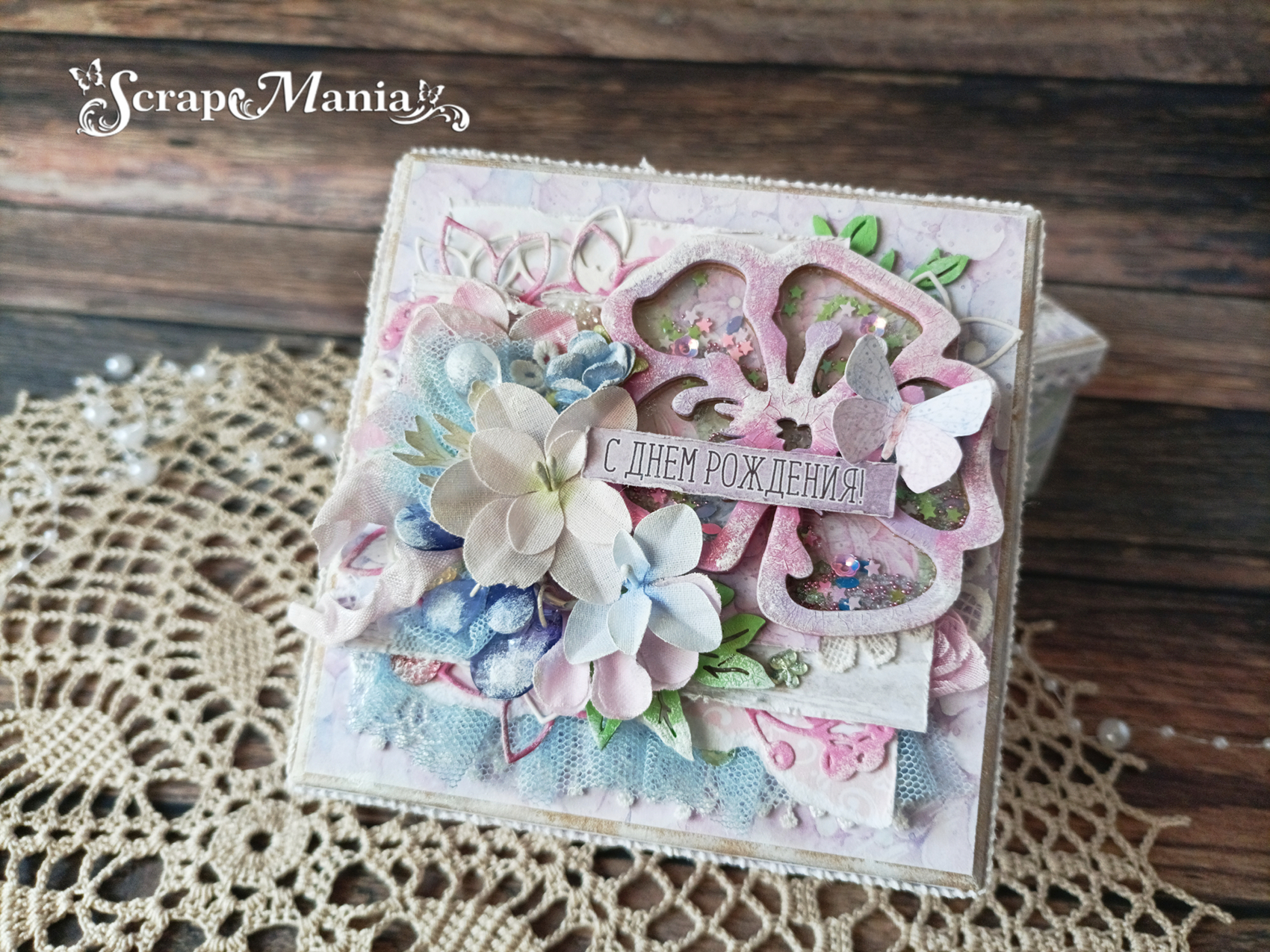 Украшение в виде сердца по центру композиции придает открытке сказочный вид. Шейкер в размер открытки особенно очарователен при движении.