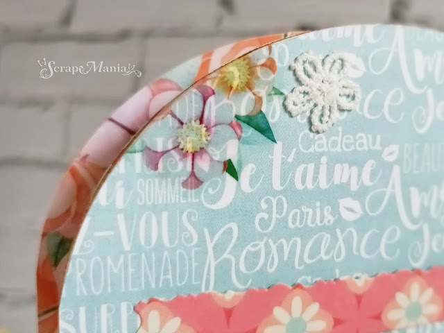 Здесь у меня отлично вписалась цветочная фишка из набора "Каникулы в Париже. Моя любовь". Сама девочка и цветочная композиция у её ног вырезаны из скрап-карты "Каникулы в Париже. Детали".